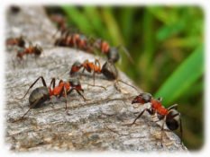 Ameisen sind kleine Insekten, die sich in sogenannten Staaten organisieren, welcher aus bis zu hundert oder Millionen von Arbeitern bestehen kann. Ihr altdeutscher Name âmeizâ bedeutet soviel wie „das emsige, arbeitsame Tier“. Ameisen sind weltweit in unterschiedlichen Arten verbreitet, 200 davon leben in Europa. Biologisch gesehen gehören Ameisen gemeinsam mit dem Schmetterling, dem „Ohrenkneifer“ und derm Skorpion zu den Gliederfüßern. Viele Ameisen sind Allesfresser und ernähren sich deshalb nicht nur von von pflanzlichem Material wie Blättern, Früchten, Pollen und Samen, sondern auch von verschiedenen Insekten, wie z.B. der Fliege, der Raupe, dem Schmetterling oder der Spinne. Ganz besonders beliebt bei den Ameisen ist jedoch die Ausscheidung der Läuse, die auch „Honigtau“ genannt wird. Im Gegenzug zu dieser Leckerei bewachen und beschützen Ameisen die Läuse vor Fressfeinden. Zu der wohl bekanntesten Allesfresser-Ameisenart gehört die Rote Waldameise, die in unseren Breiten sehr häufig in jeglichen Laub- und Nadelwäldern anzutreffen ist. Die in Deutschland am häufigsten vorkommende Schwarze Wegameise und ihre etwas hellere Vertreterin, die Gelbe Wiesenameise, gehören zu den Räubern und Aasfressern. Sie ernähren sich, wie es der Name schon sagt, zusätzlich von Kadavern, kleinen Säugetieren, Vögeln und sogar Schlangen. Ameisen wohnen in der Regel unter der Erde in sogenannten Erdbauten, Erdhügel oder Erdnestern. Mitunter bevorzugen sie auch feuchte Standorte unter Steinen.